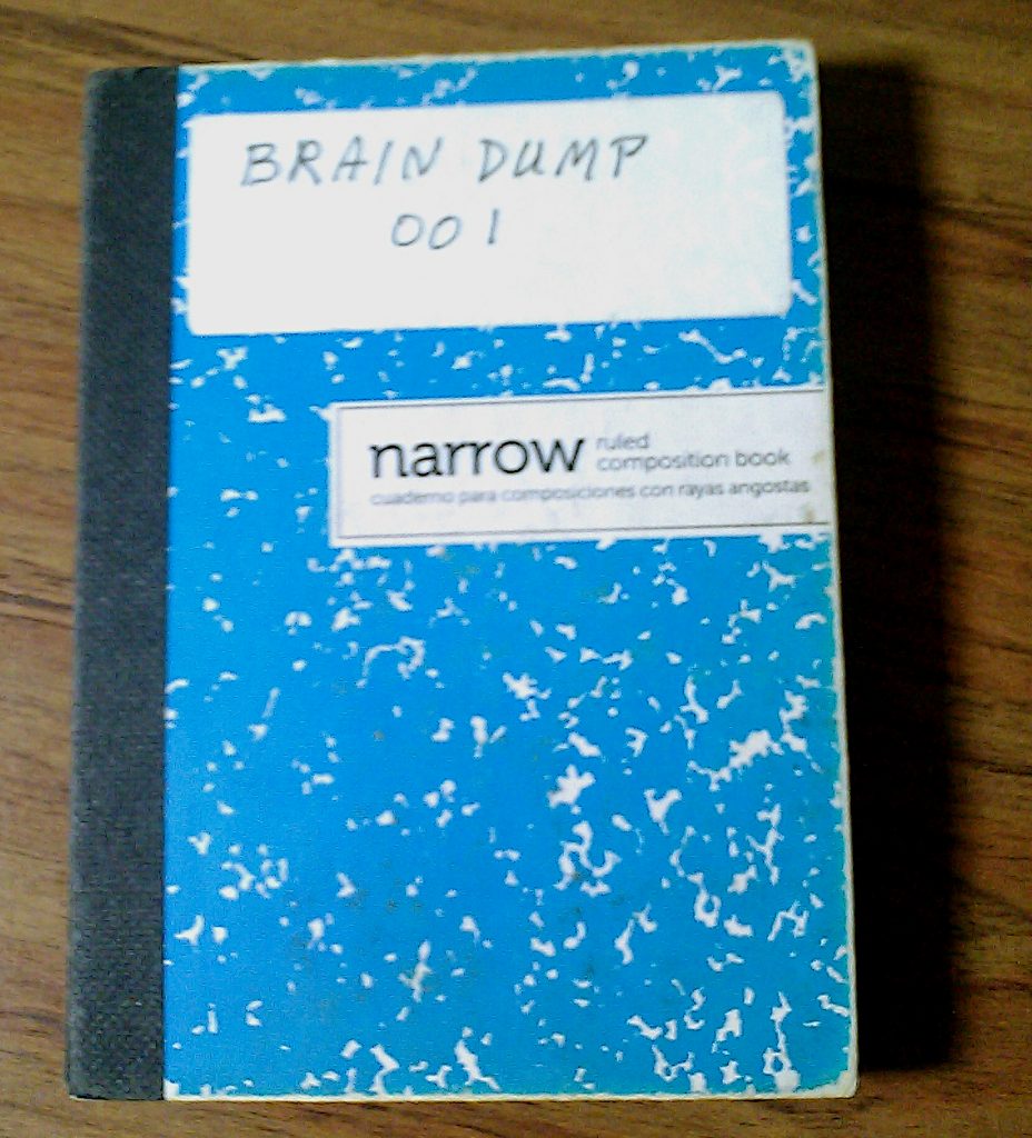 Here is a photo of my brain dump book. I bought a package of cheap 4.5″ by 3.25″ notebooks at the office supply store. I put an address label on the front and labeled it “BRAIN DUMP 001,” as it’s the first one, and I didn’t know how many I would eventually use.